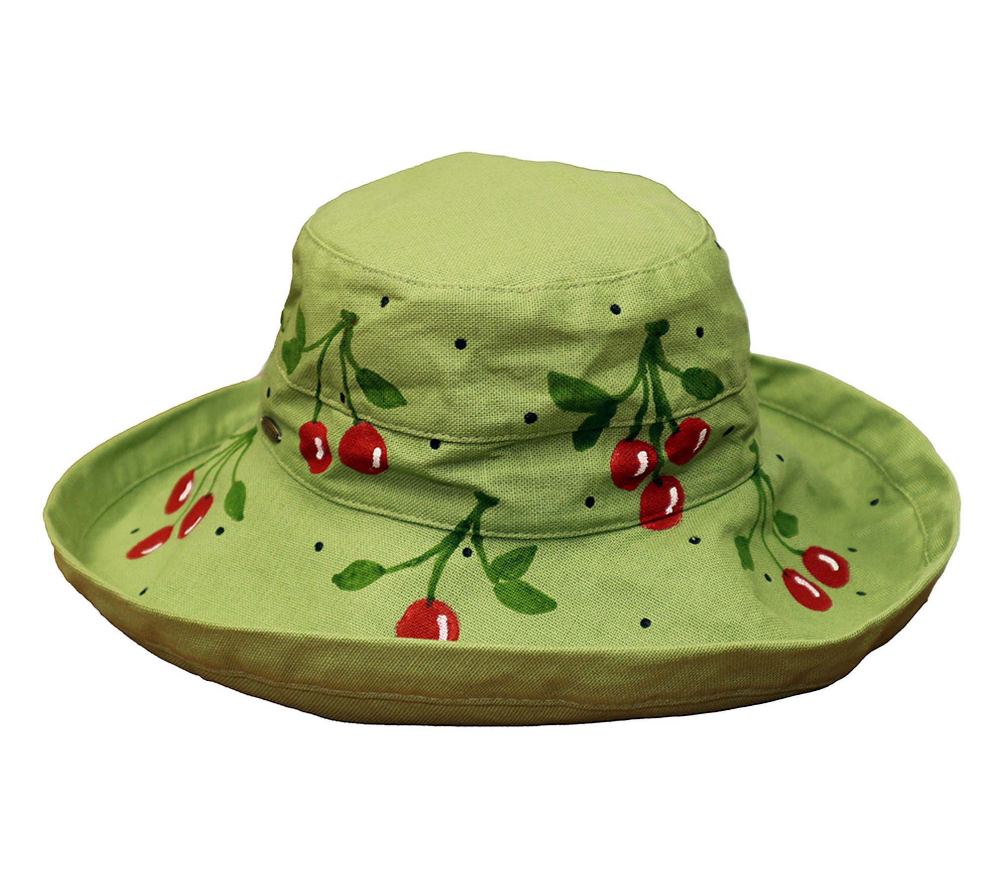 Cherries hand painted on a Fern color Sun Hat.