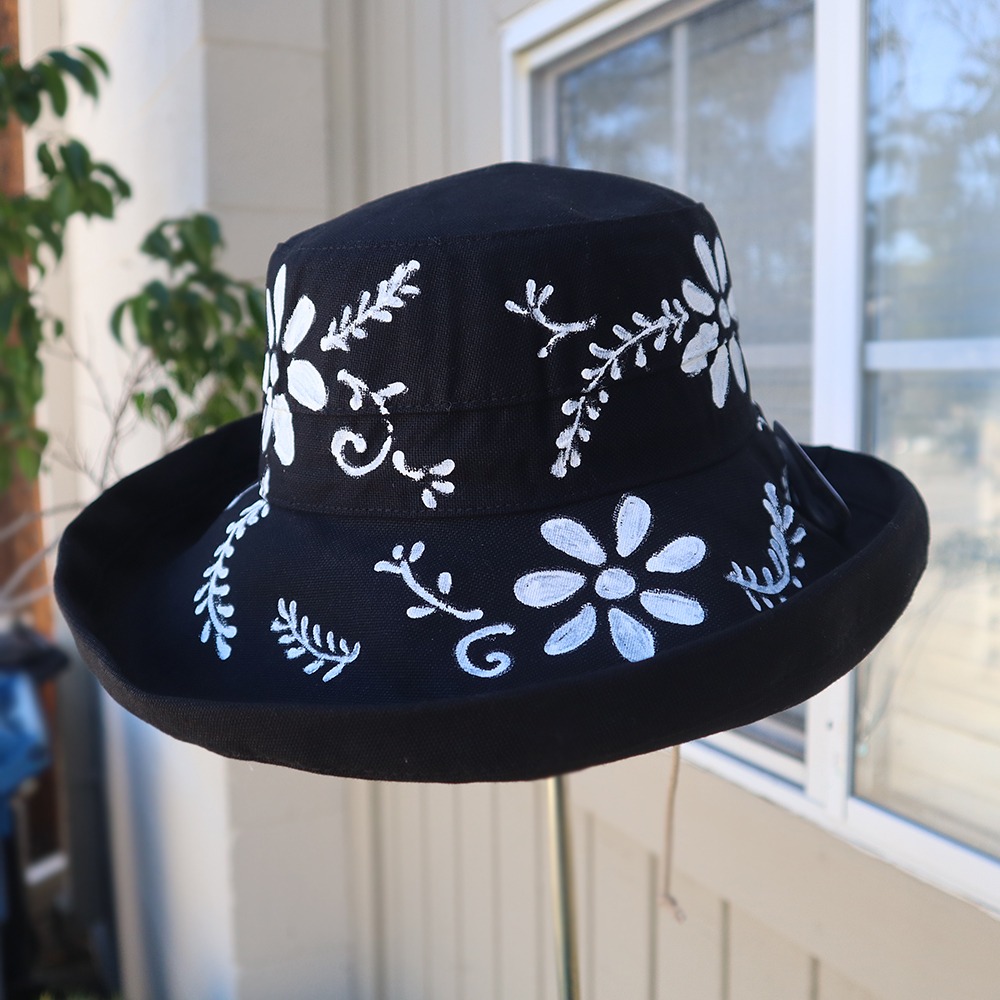 Cool comfortable 100% cotton sun hats with hand painted designs. One size fits all up to 22 inches, with an inner drawstring to adjust size. 50 SPF, 3″ brim. Travels well.