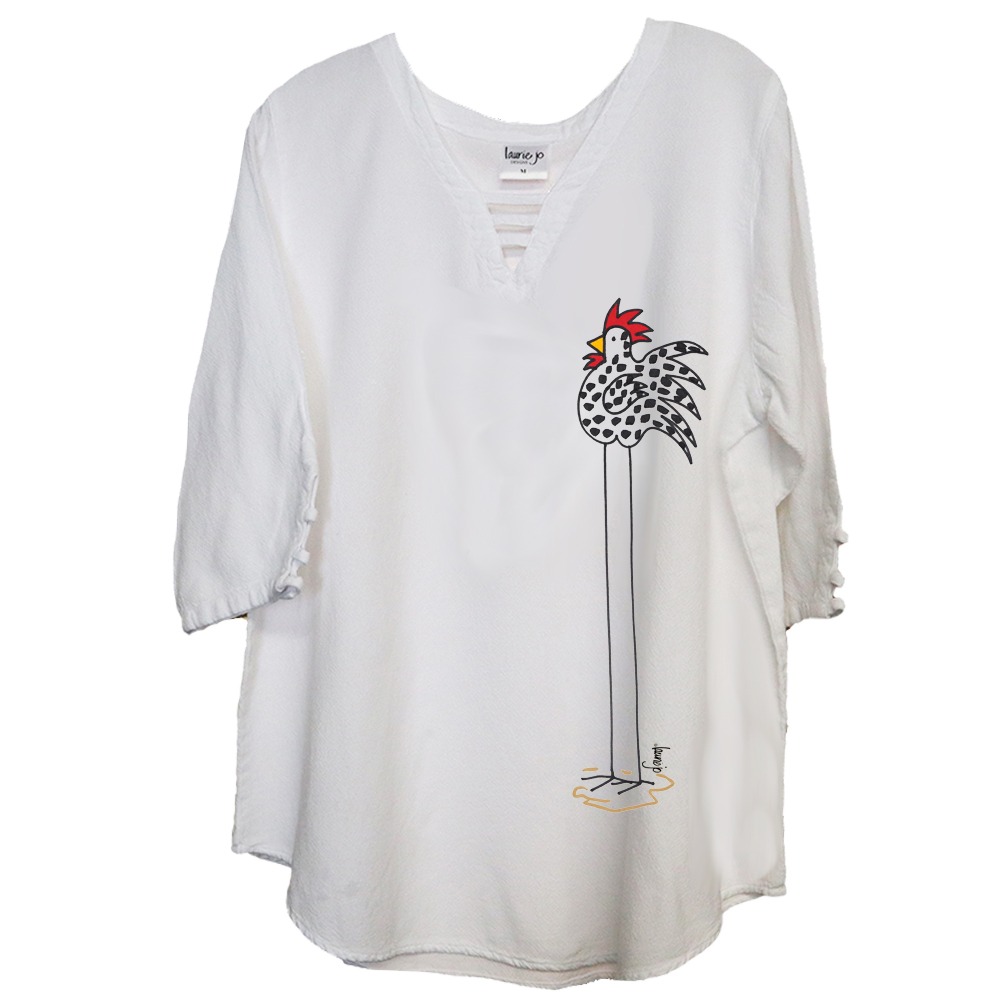V-Lattice crinkle cotton top. Loose fit, medium weight. Hand painted with the Chicken design. There is sun/show dirt/wear on the shoulders. A good wash will help but may not take all of it out.