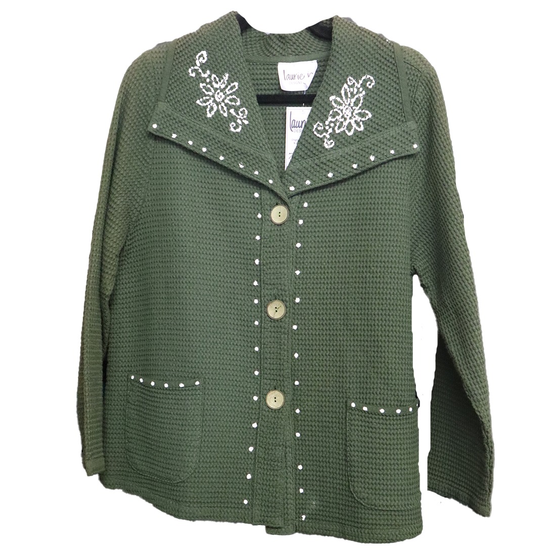 100% cotton waffle weave jacket hand painted with India Flower design. This jacket has sun/show damage along the shoulders and arms. You may or may not be able to get it out with a good wash, Shout or Spray and Wash. Bargain Priced. No returns.