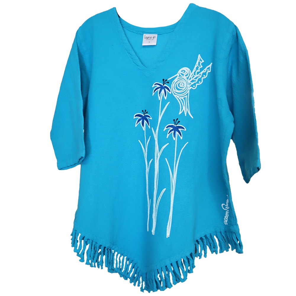 Fringe crinkle cotton top. Loose fit, medium weight. Hand painted with the  Hummingbird design.