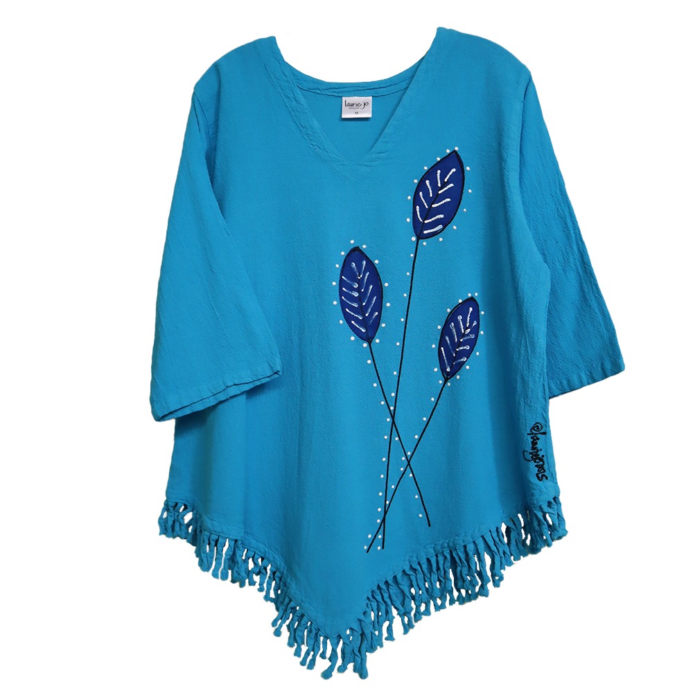 Fringe crinkle cotton top. Loose fit, medium weight. Hand painted with the Blue Striped Leaf design. This style runs large.