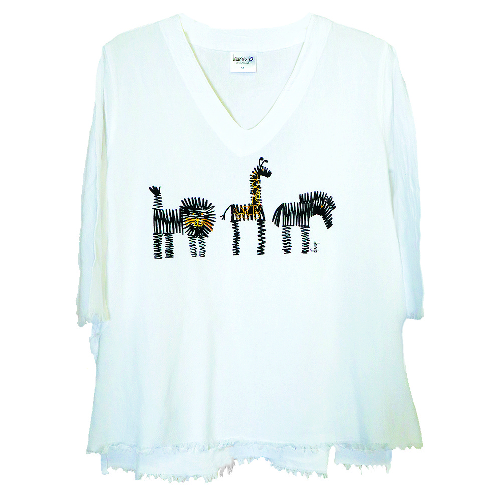 Loose fitting crinkle cotton Frayed Top with the Black Zoo Row design.