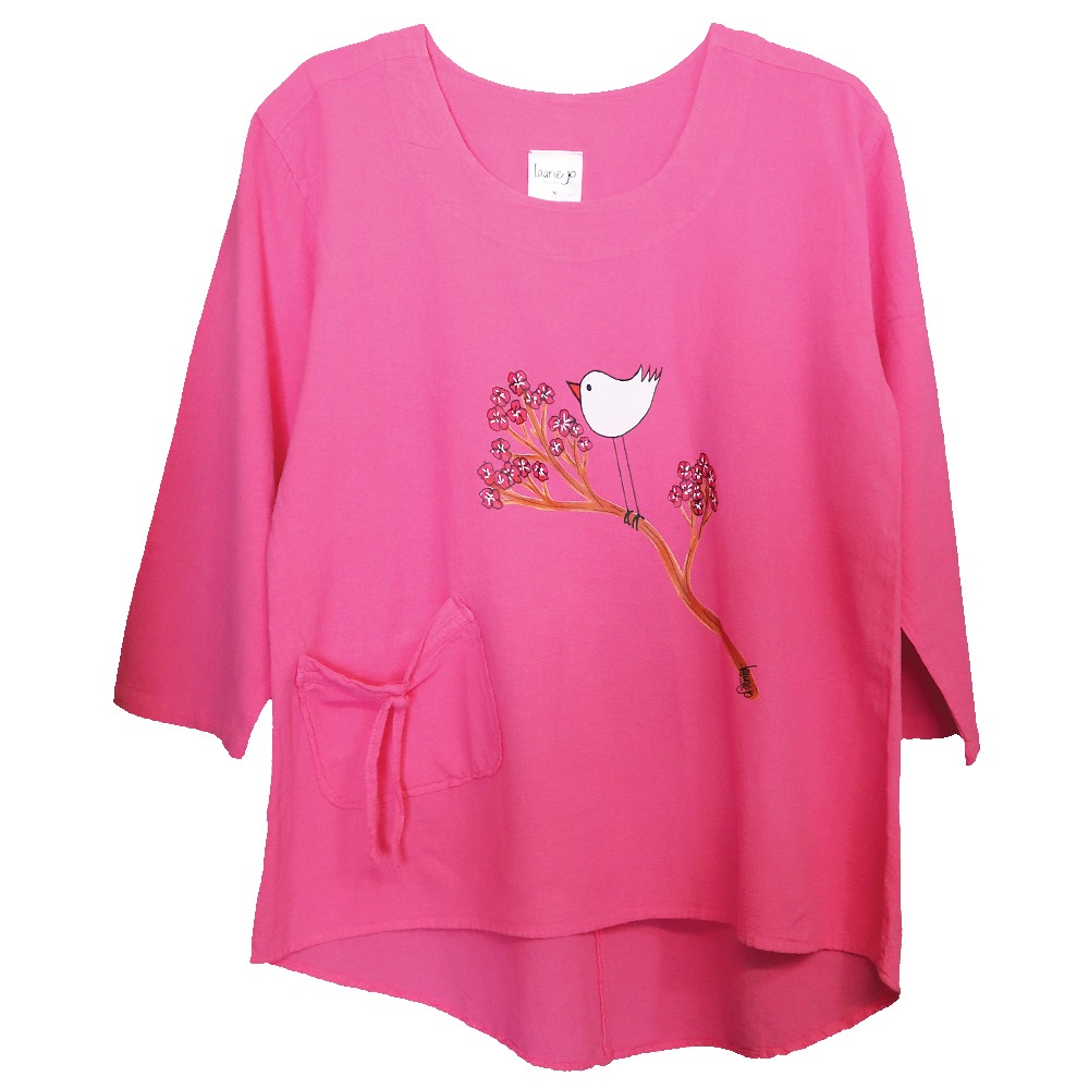 3/4 sleeve hi lo hem Tunic with Pocket. Lightweight crinkle cotton, pre shrunk. Adorned with the Yellow Sunflower.