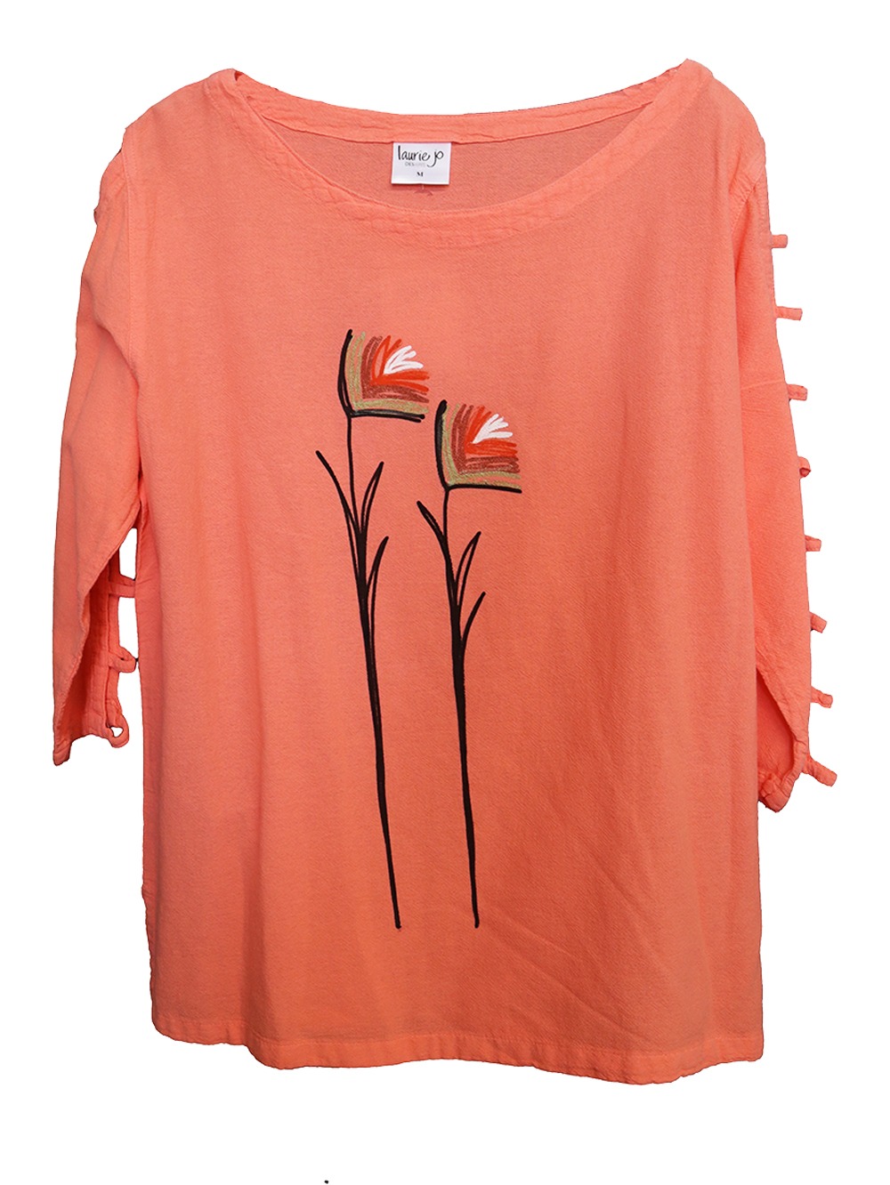 Lightweight Crinkle Cotton Lattice Sleeve Top. Straight hem with open lattice sleeves at the top of the arm. Runs slightly small. Pre-shrunk 100% cotton. Made and painted in the USA.