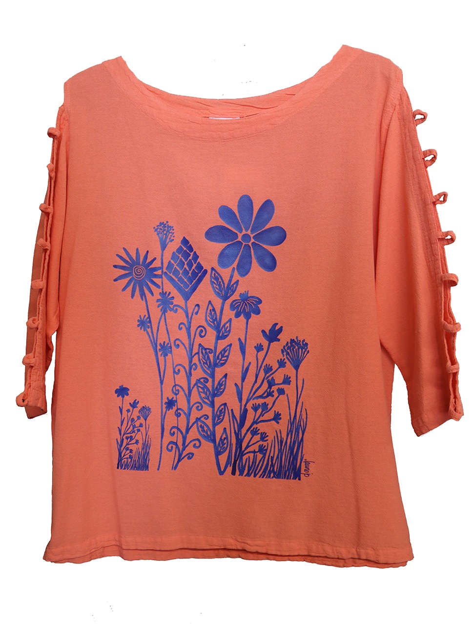 Lattice Sleeve Crinkle Cotton top hand printed with the Blue Garden. A very popular shirt!
