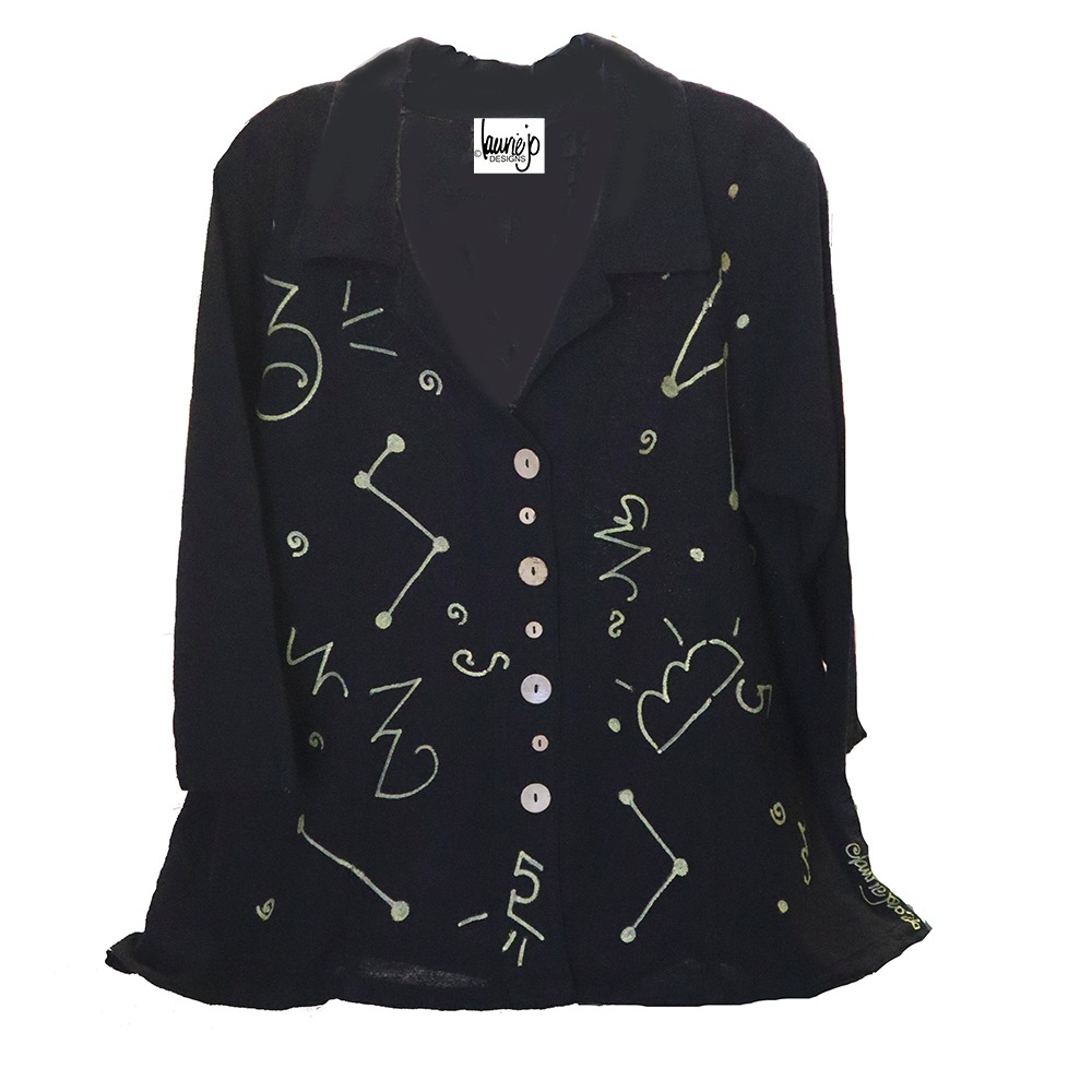 Novelty Button top hand painted with Gold Kandinsky design. Flowy and loose. Wear as a jacket or a top.