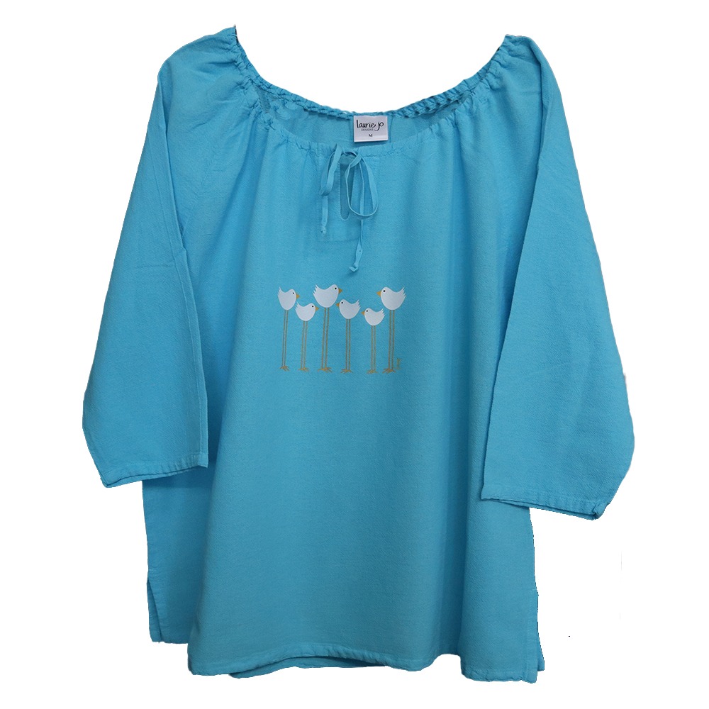 Lightweight Crinkle Cotton 3/4 Sleeve Peasant Top. This lightweight, Pre-shrunk 100% cotton top is perfect for hot summer days and cool nights. Loose fit. Made and painted in the USA.