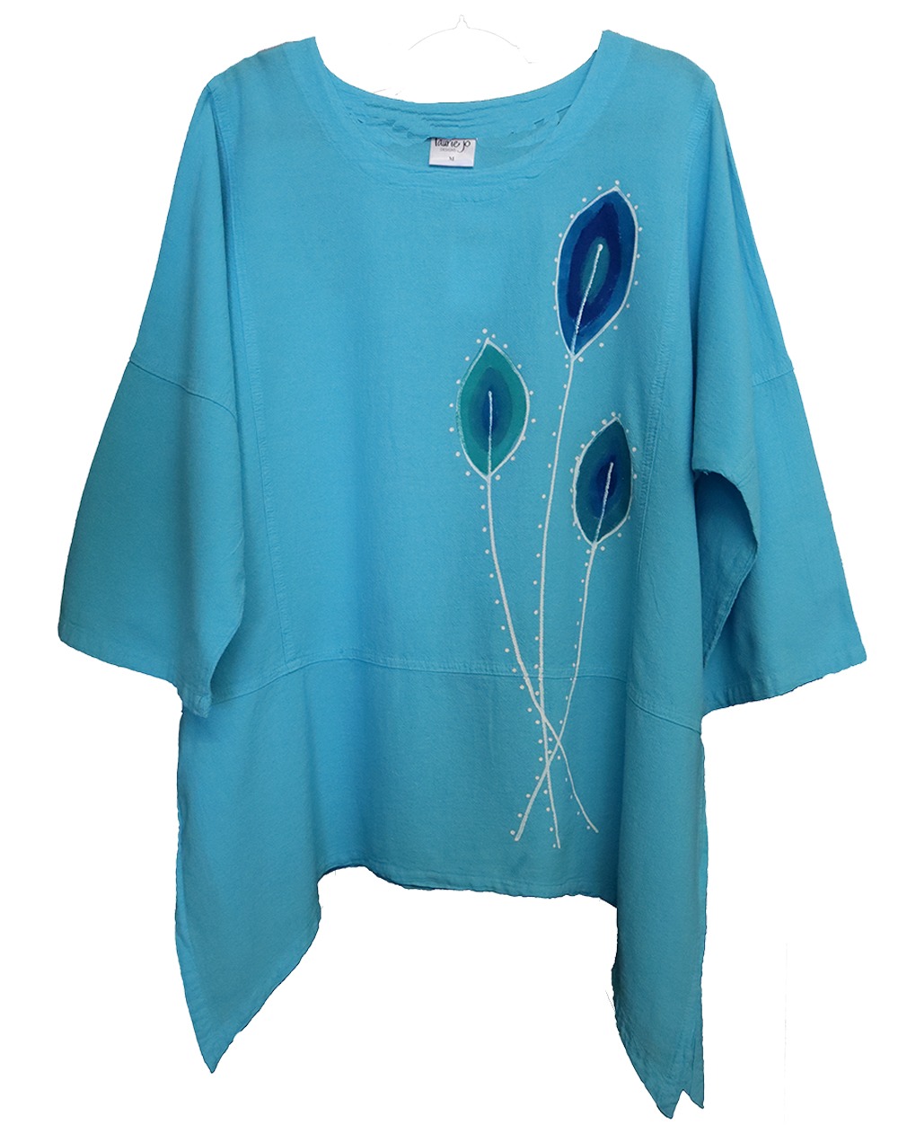 Lightweight Crinkle Cotton Tunic. Big and generous sizing is the name of the game of this shirt. Dolman sleeves are great to leave long or roll up. Tie the shark bite hem on both sides or one for an asymmetrical look. Go down TWO sizes from your regular size. Pre-shrunk, made in USA.