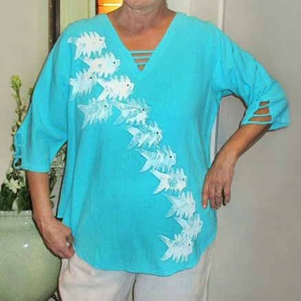 Medium weight Crinkle Cotton V-Lattice 3/4 Sleeve Top.  Slight shirt tail hem. Longer length. Loose fit. Pre-shrunk 100% cotton. Made and painted in the USA.
