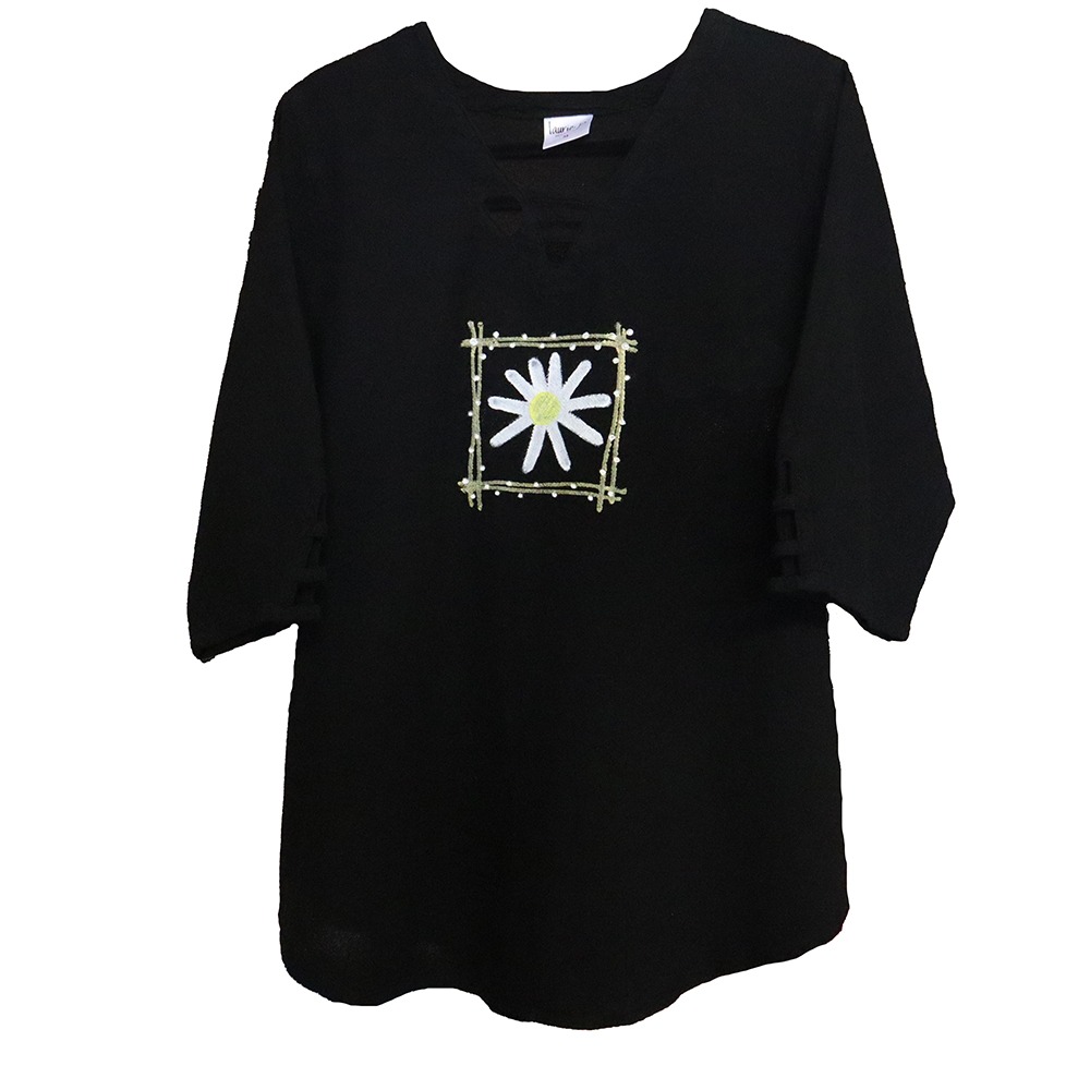 V-Lattice crinkle cotton top. Loose fit, medium weight. Hand painted with the Daisy Box design.