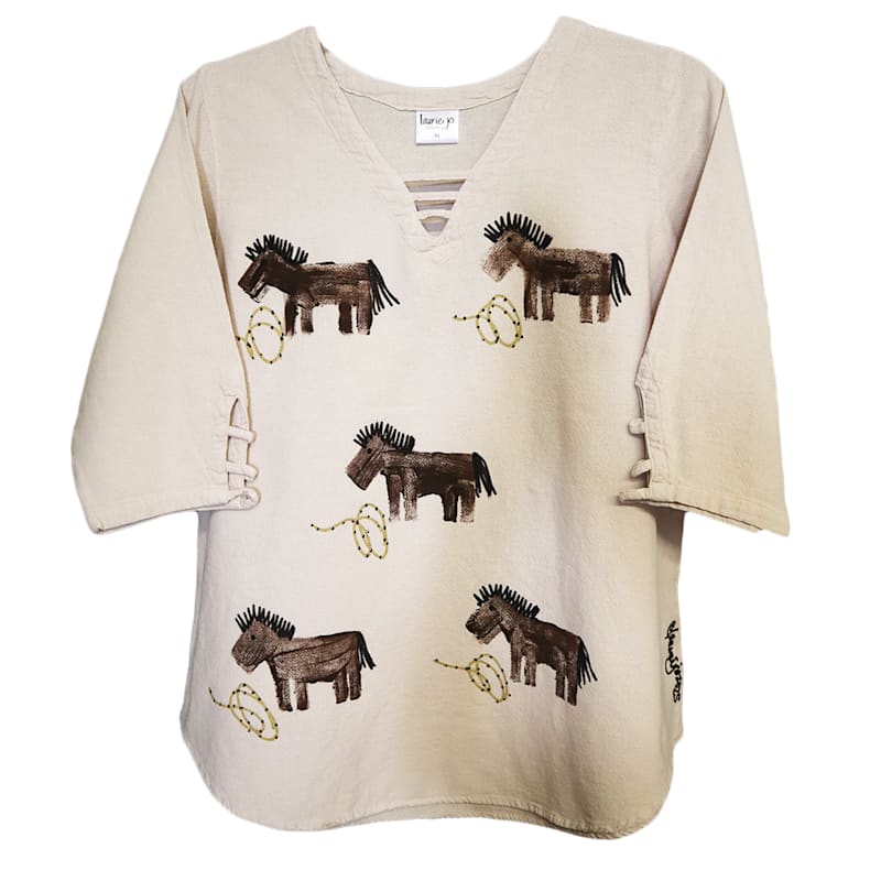 V-Lattice crinkle cotton top. Loose fit, medium weight. Hand painted with Horse with Lasso design.