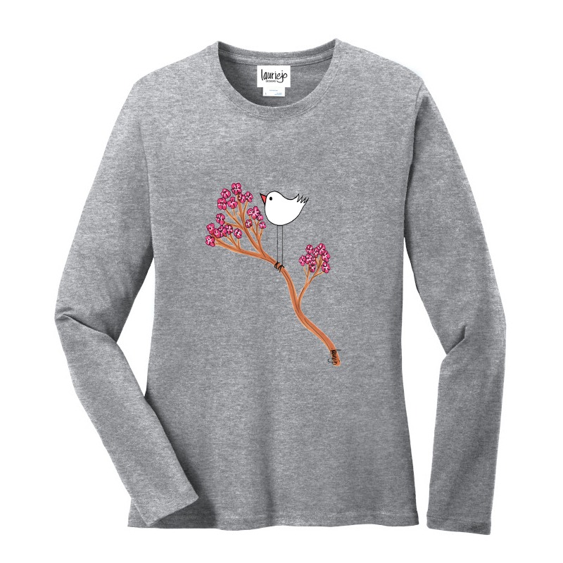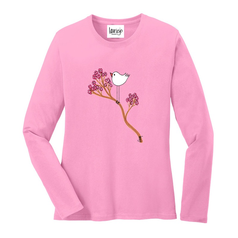 Pre-shrunk cotton, long sleeve, ladies tee. Printed and painted designs. Slightly fitted. Wash inside out, cold water, hang dry. Tee shirts even though they are pre-shrunk will shrink if you run them thru a hot dry cycle. (not recommended)