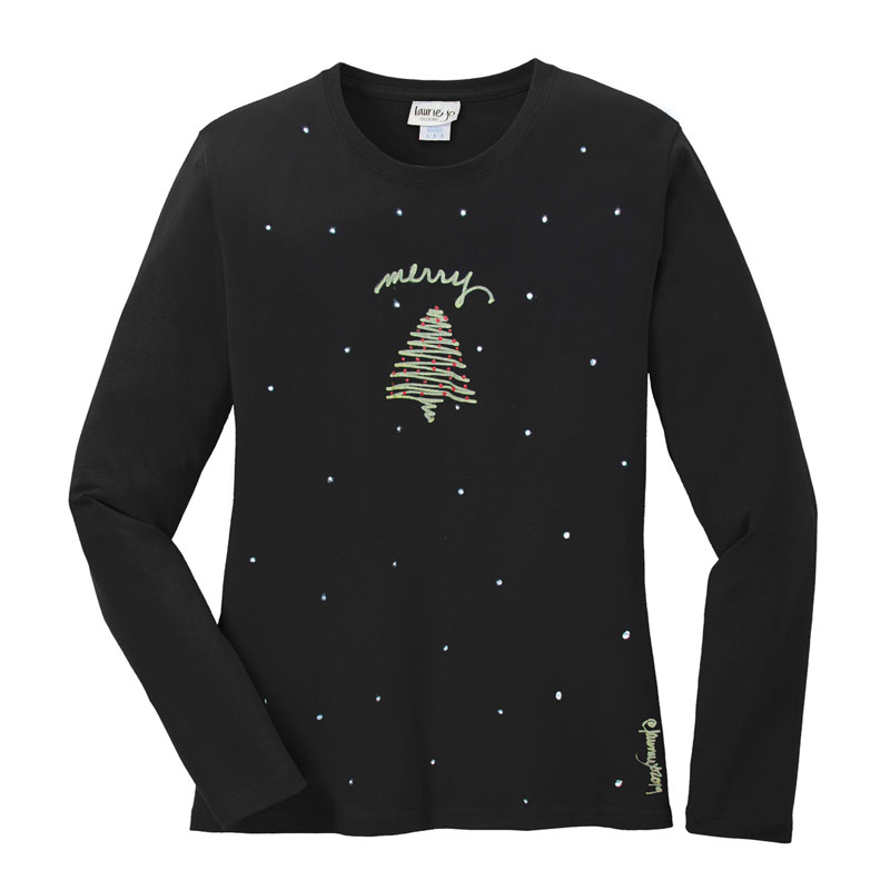 Ladies, long sleeve, pre-shrunk cotton t-shirt with hand-painted Merry Squiggle Tree design.
