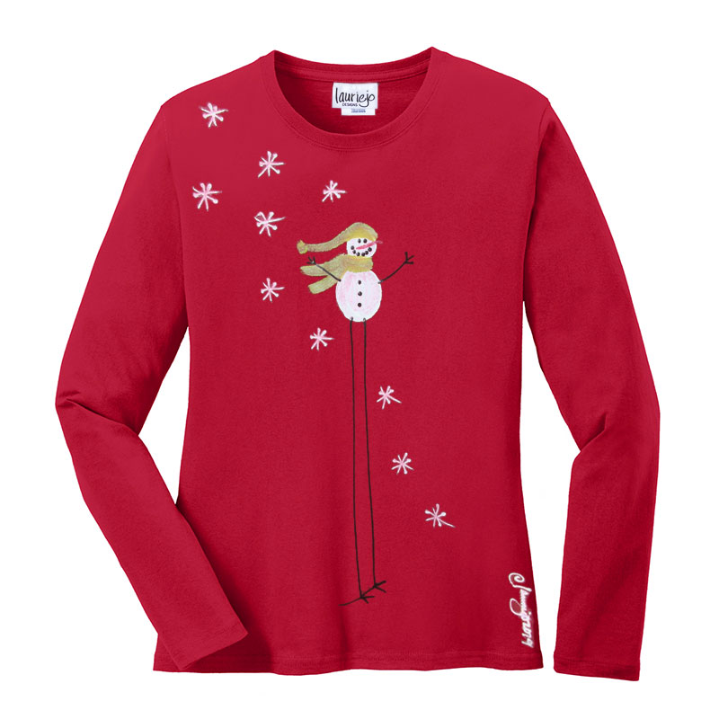 Ladies, long sleeve, pre-shrunk cotton t-shirt with Snowman design.