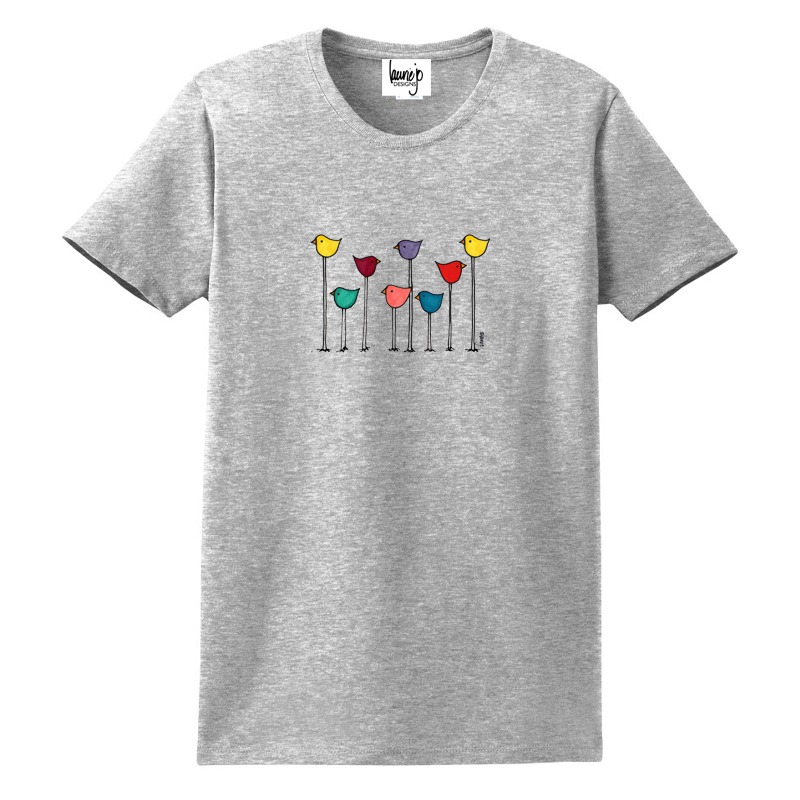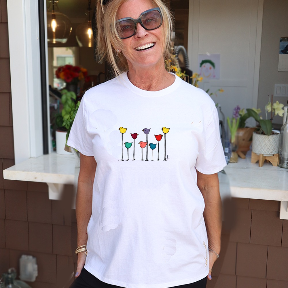 Ladies, short sleeve, pre-shrunk cotton t-shirt with hand-painted Multi Bird Row design.
