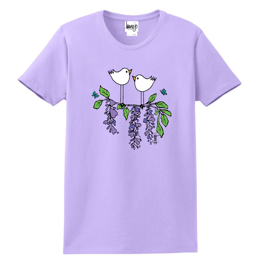 Pre-shrunk cotton, short sleeve, ladies tee. Printed and painted designs. Small design on the back. Slightly fitted. Wash inside out, cold water, hang dry. These shirts will shrink if you run them thru a full dry cycle.